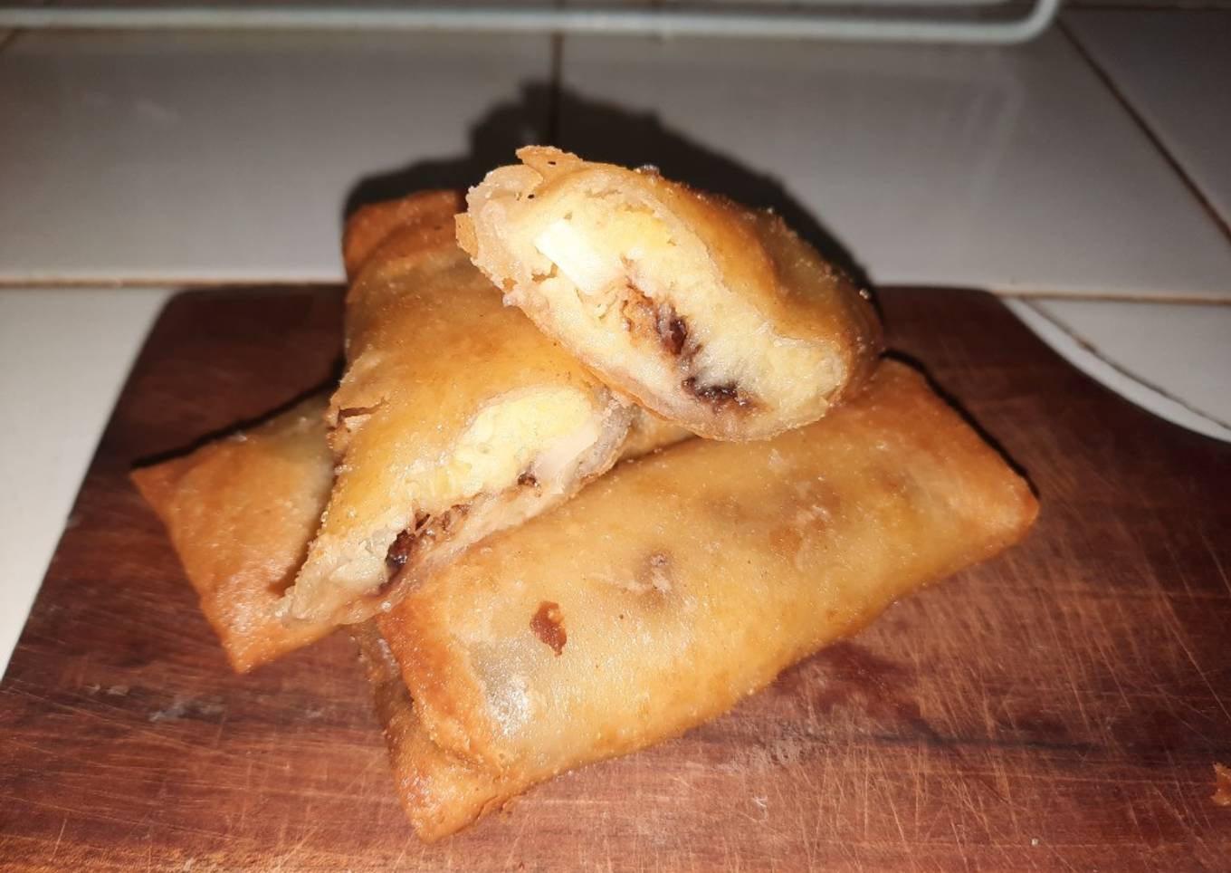 - Lumatkan tape, buang batangnya. Kemudian masukkan skm, aduk hingga rata. Siapkan kulit lumpia tarus 1/2 sdm tape, keju dan coklat, kemudia tutup dengan 1/2 sdm tape.