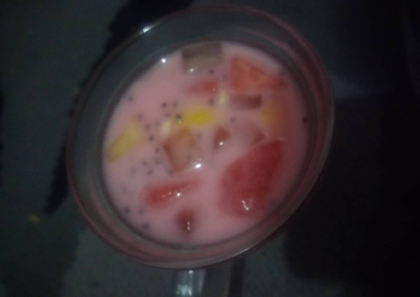 - Campurkan semua buah dan selasih di wadah agak besar. Lalu seduh susu dengan air panas di tambah gula sesuai selera. Masukkan di wadah berisi buah.
