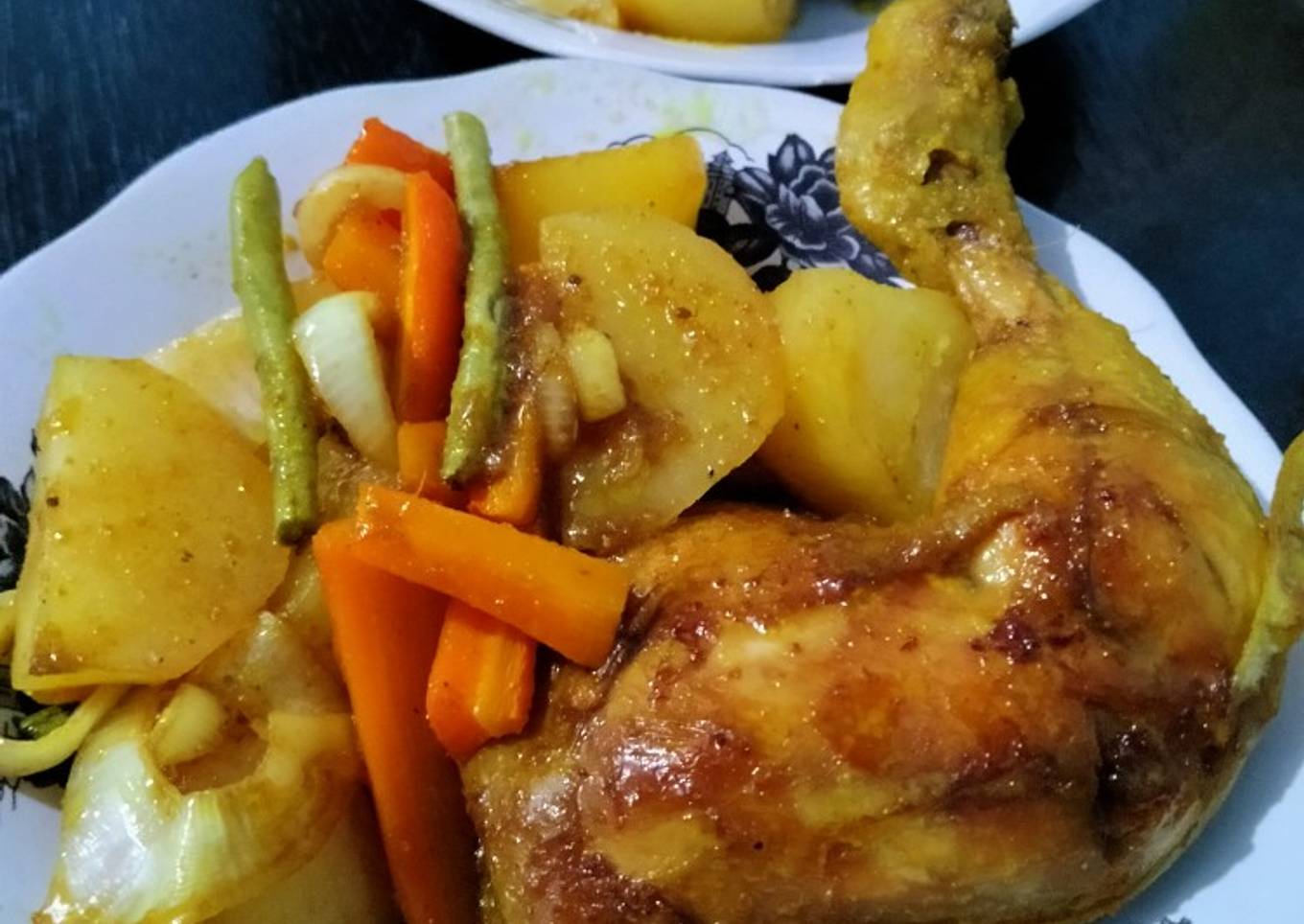 - Siapkan wadah, susun ayam yang sudah dimasak, bersama kentang, wortel, buncis dan irisan bawang bombay. Olesi diatasnya dengan bahan olesan, masak dioven (180°c selama 30 menit) selamat mencoba❤️