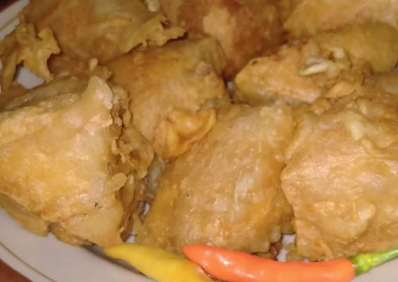 - Balut tahu kedalam adonan tepung, goreng hingga keemasan.